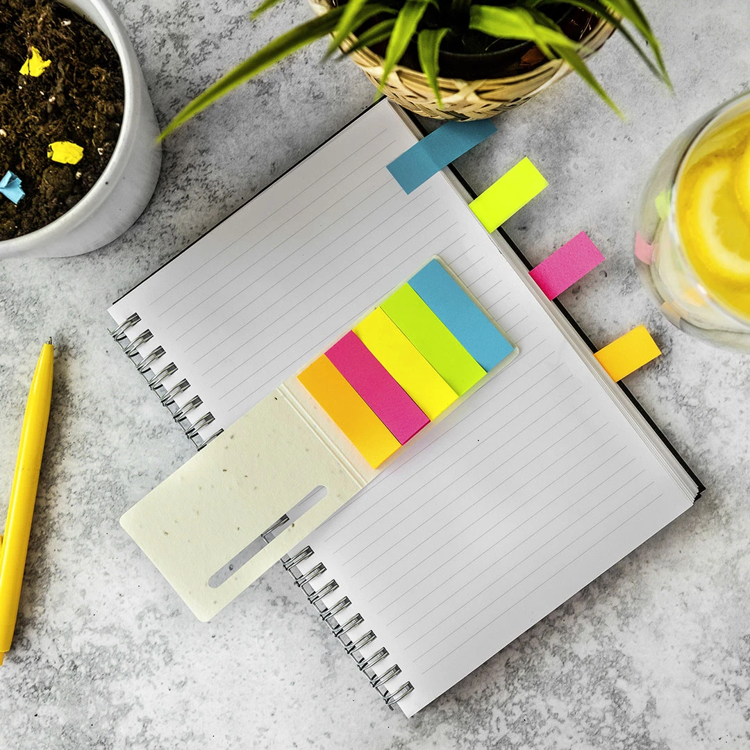 Umweltfreundliches Notizset aus Saatpapier (pflanzbare Papier mit Samen), das nach Gebrauch eingepflanzt werden kann und dem Produkt einen zusätzlichen nachhaltigen Wert verleiht. Geeignet für Schule, Universität oder «Back to School»-Werbekampagnen. Das Set enthält Haftnotizen in leuchtenden Farben, ideal zum Markieren und Organisieren.