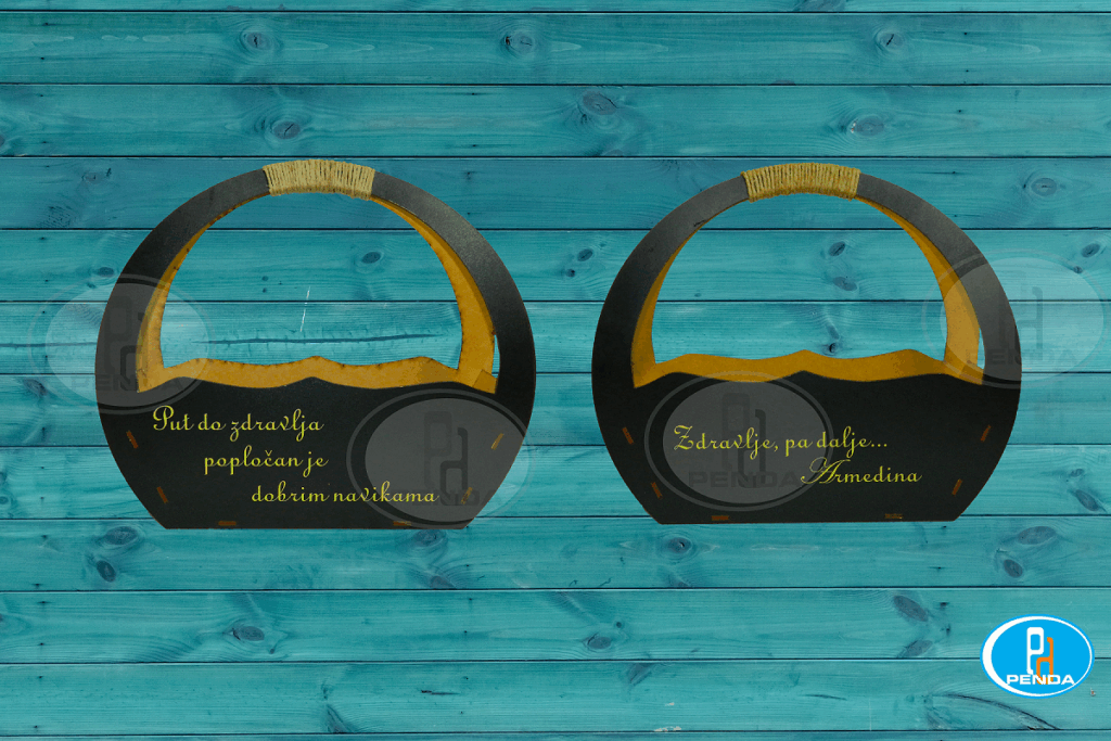 Kao što smo vas navikli predstavljamo još jednu ideju za poklon. Kao i svi ostali pokloni iz naše ponude i ovaj poklon može biti personalizovan i odštampan sa motivima po želji. Korpa je napravljena od šperploče i lakirana u crnu boju. Štampa